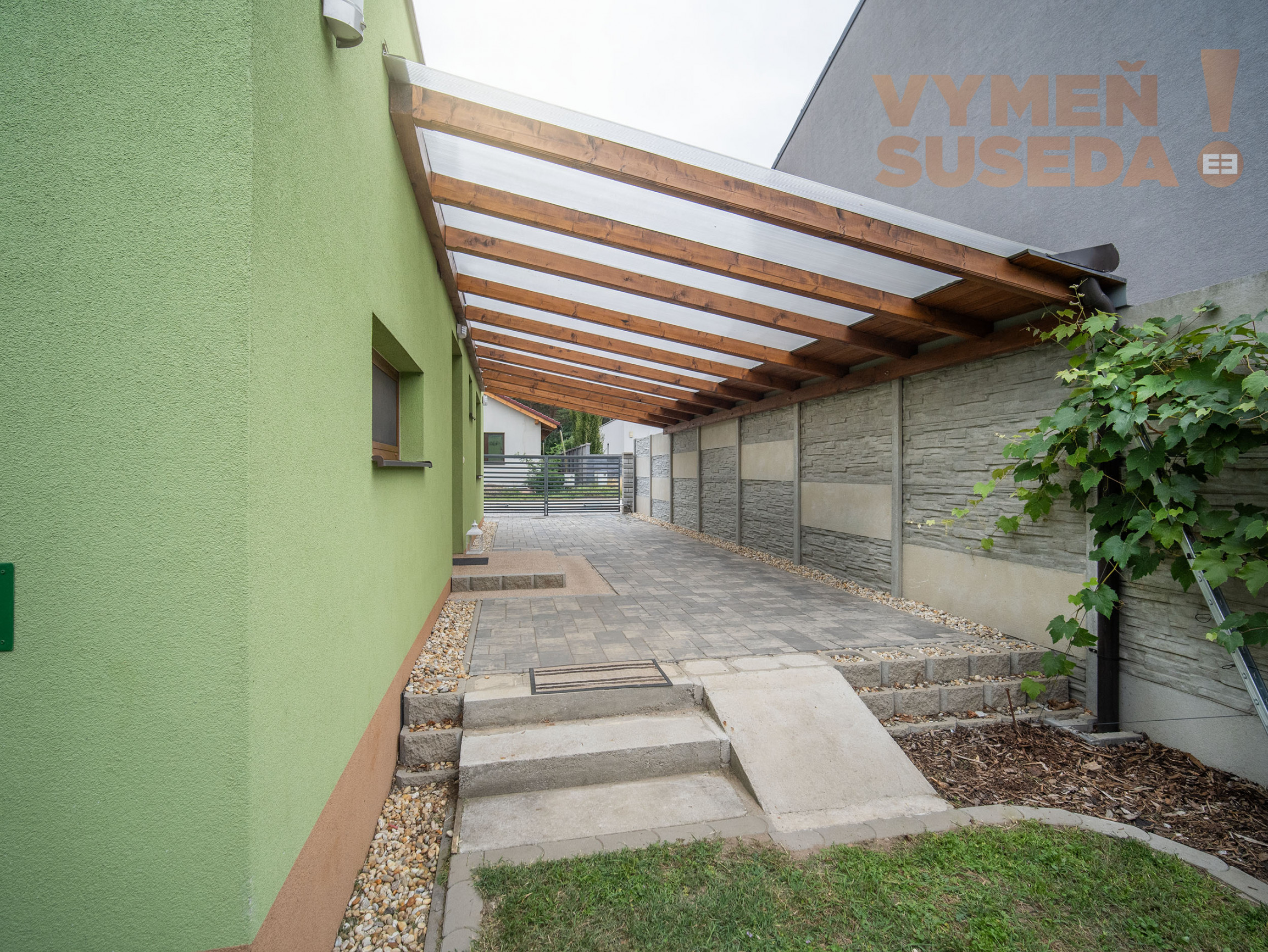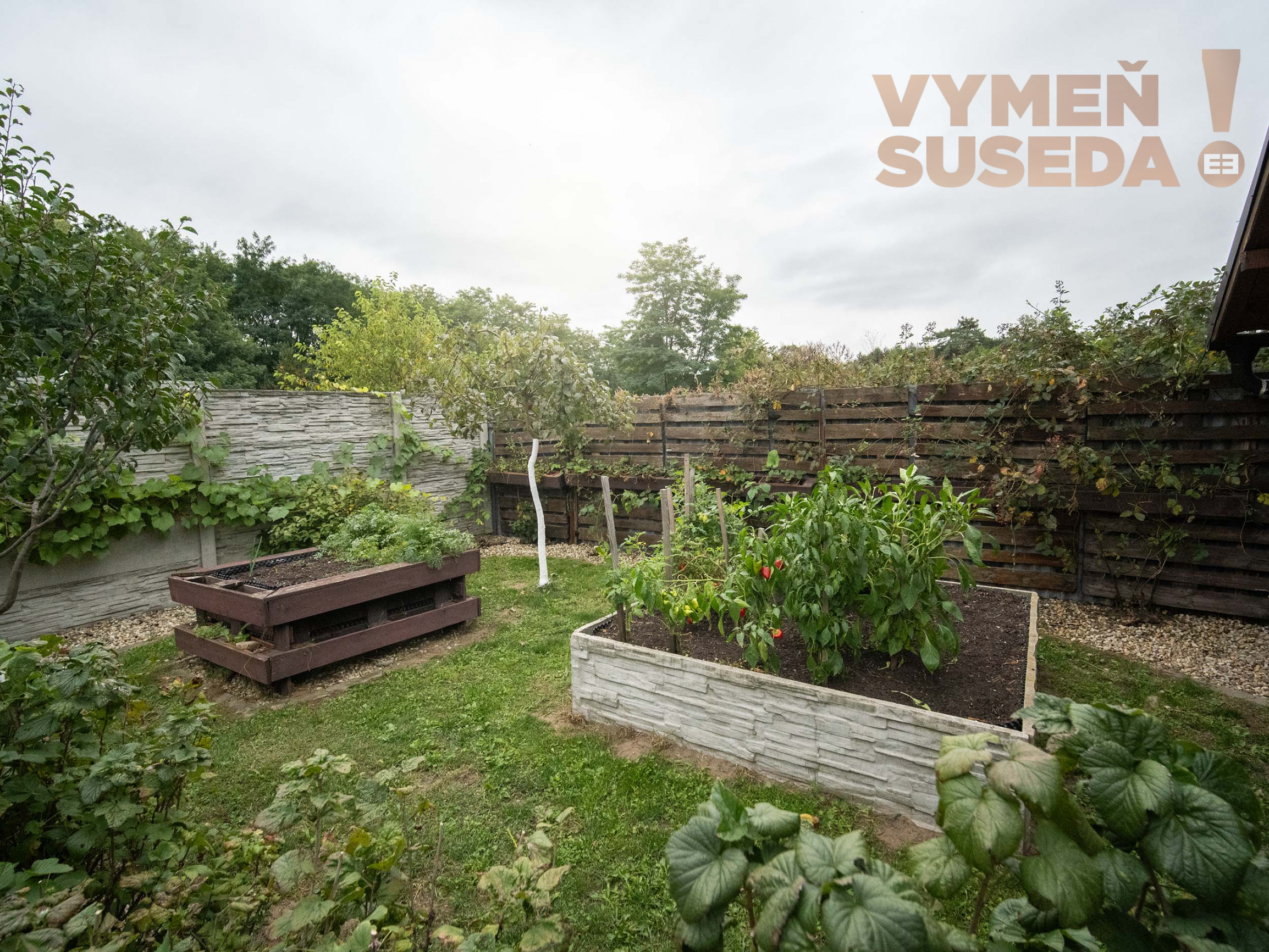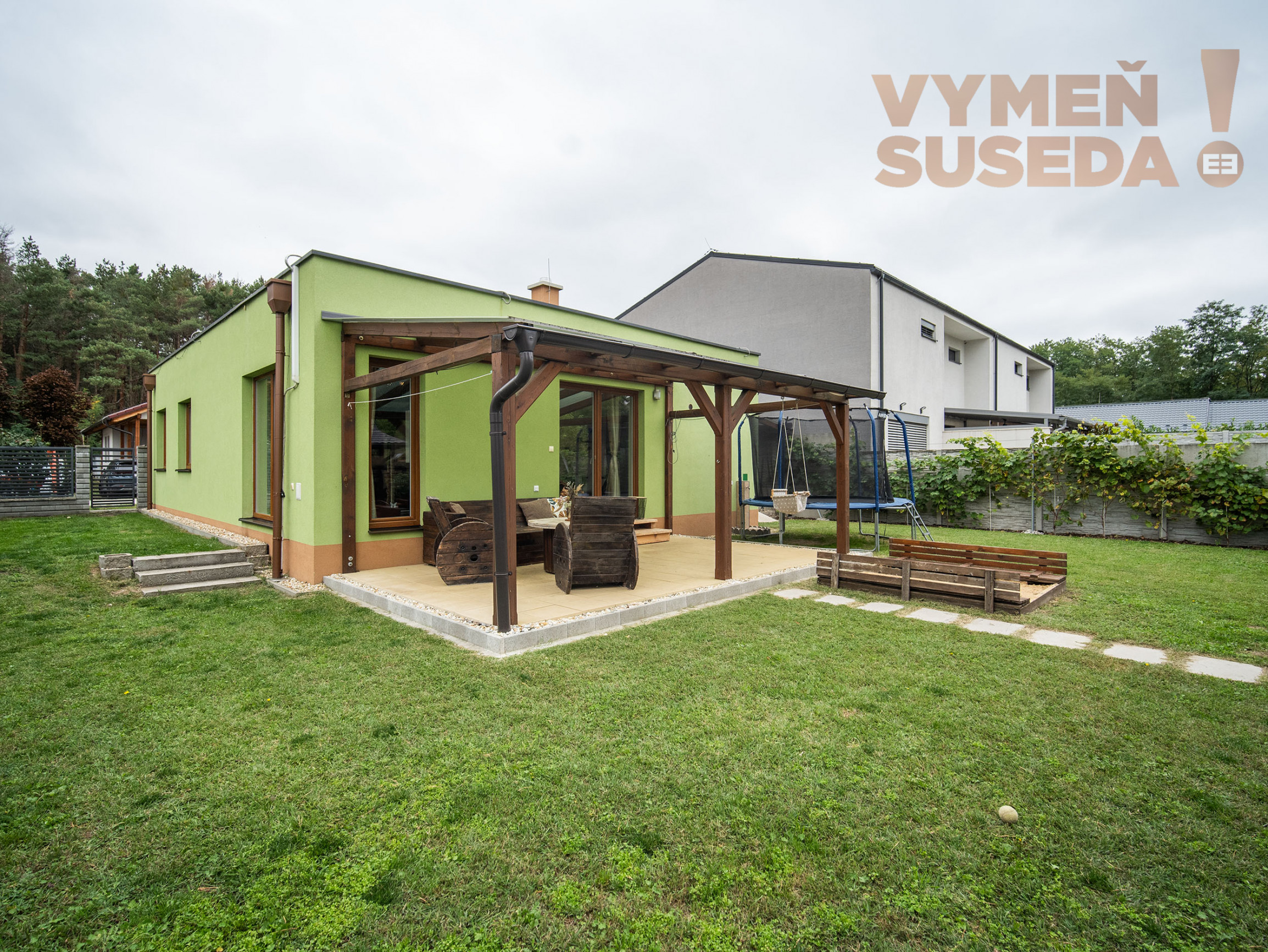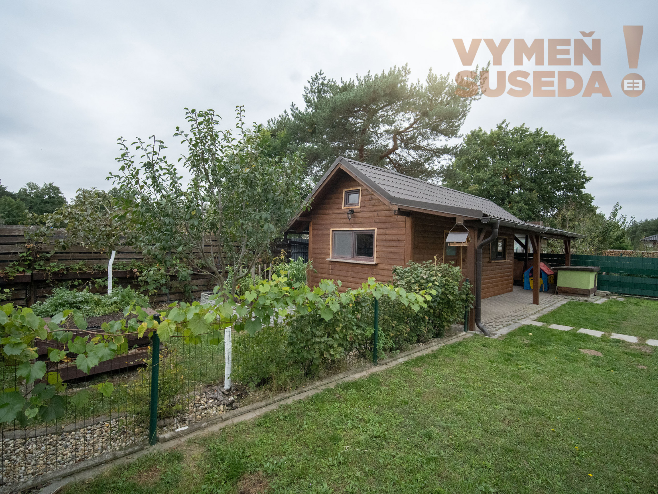 K pohodliu prispieva krytá terasa s výhľadom do záhrady. Pozemok je plný zelene, nechýba ani vinič s trativodom, ktorý slúži ako závlaha. Veľký záhradný domček poslúži ako sklad či dielňa, disponuje vlastným kúrením, elektrickými zásuvkami aj osvetlením. Rodiny s deťmi ocenia pieskovisko a hojdačky pri dome. Parkovanie je vyriešené až pre štyri autá – dve miesta sa nachádzajú pod prístreškom, ďalšie dve pred domom. Komfort dopĺňa automatická brána na diaľkové ovládanie.