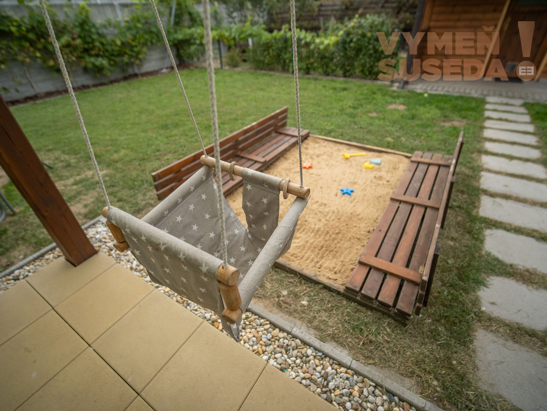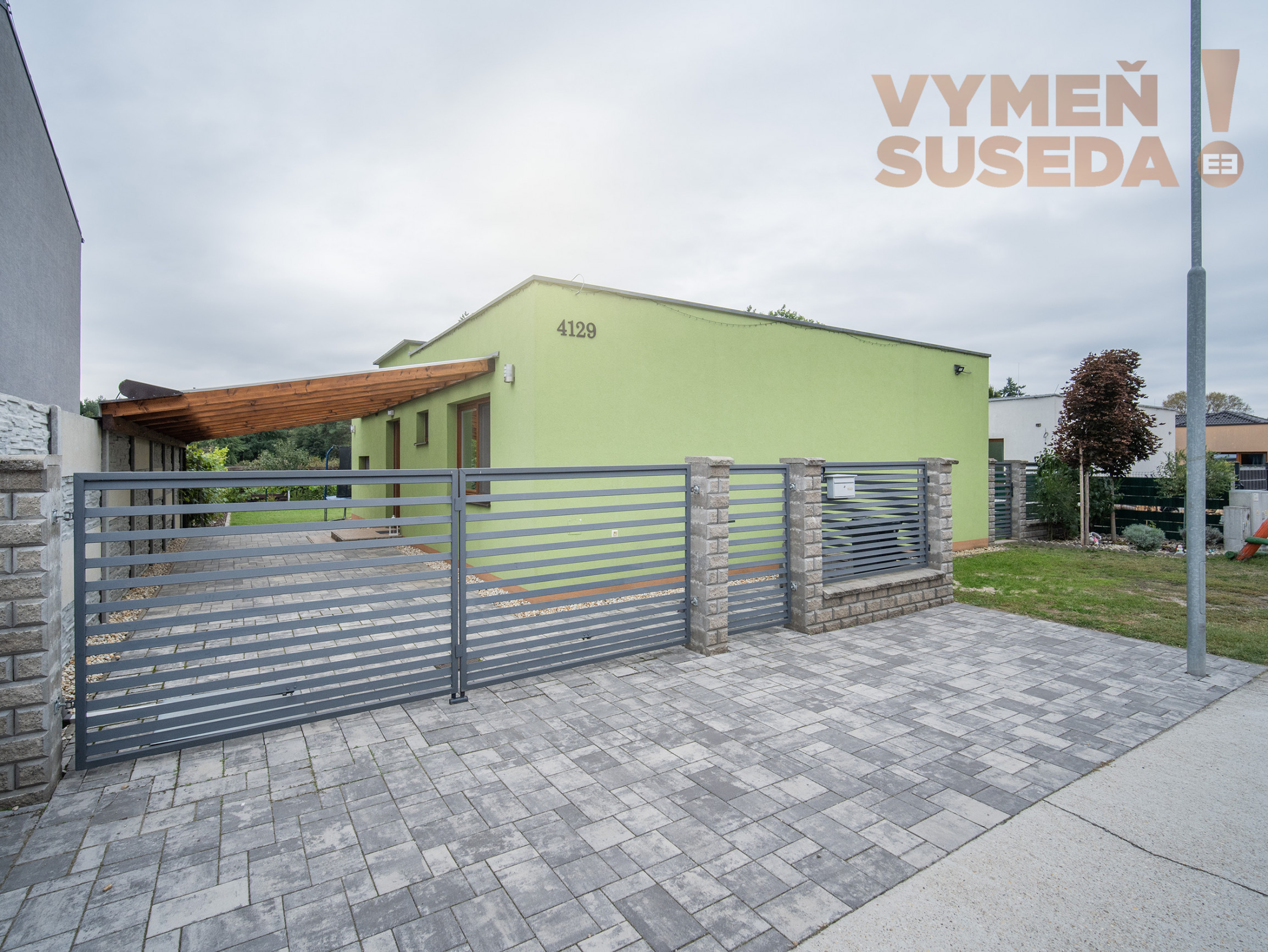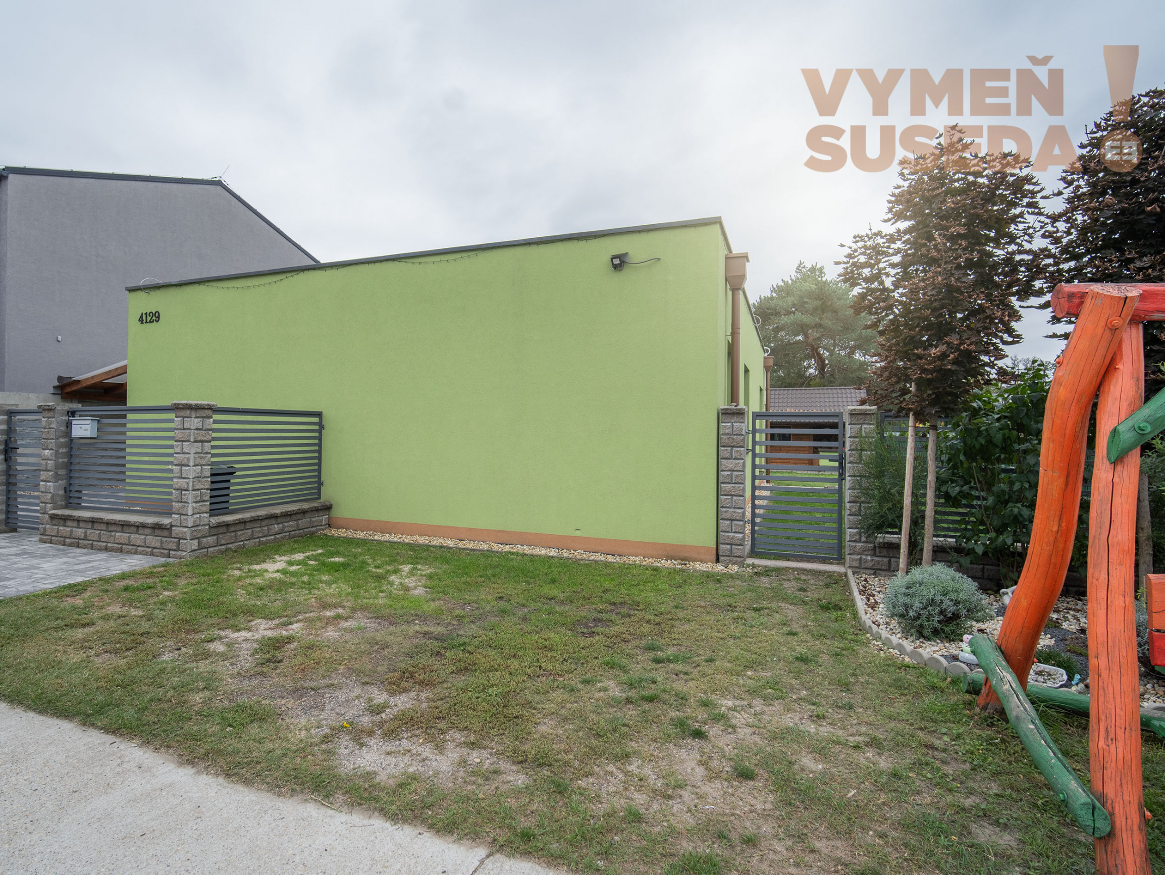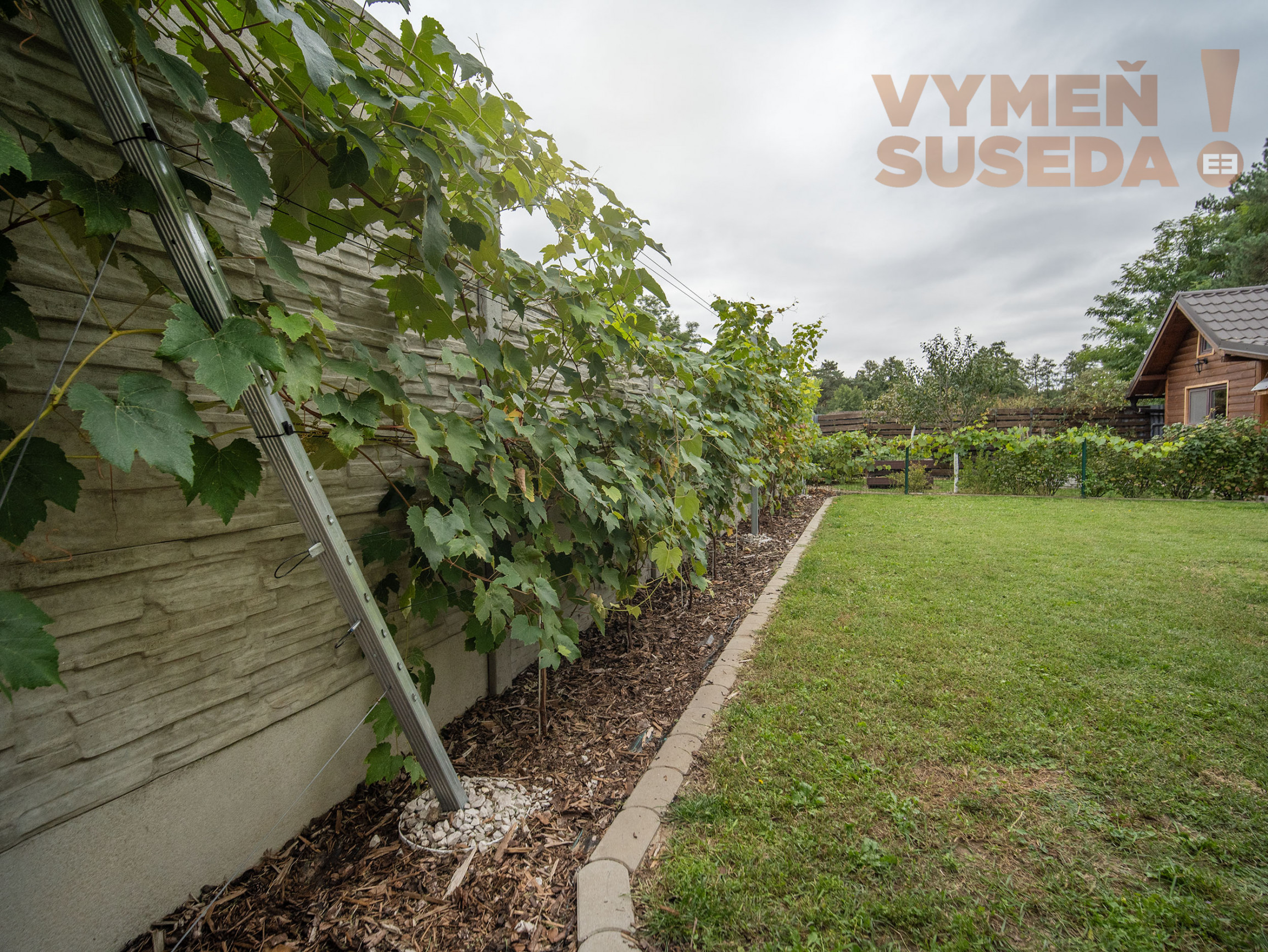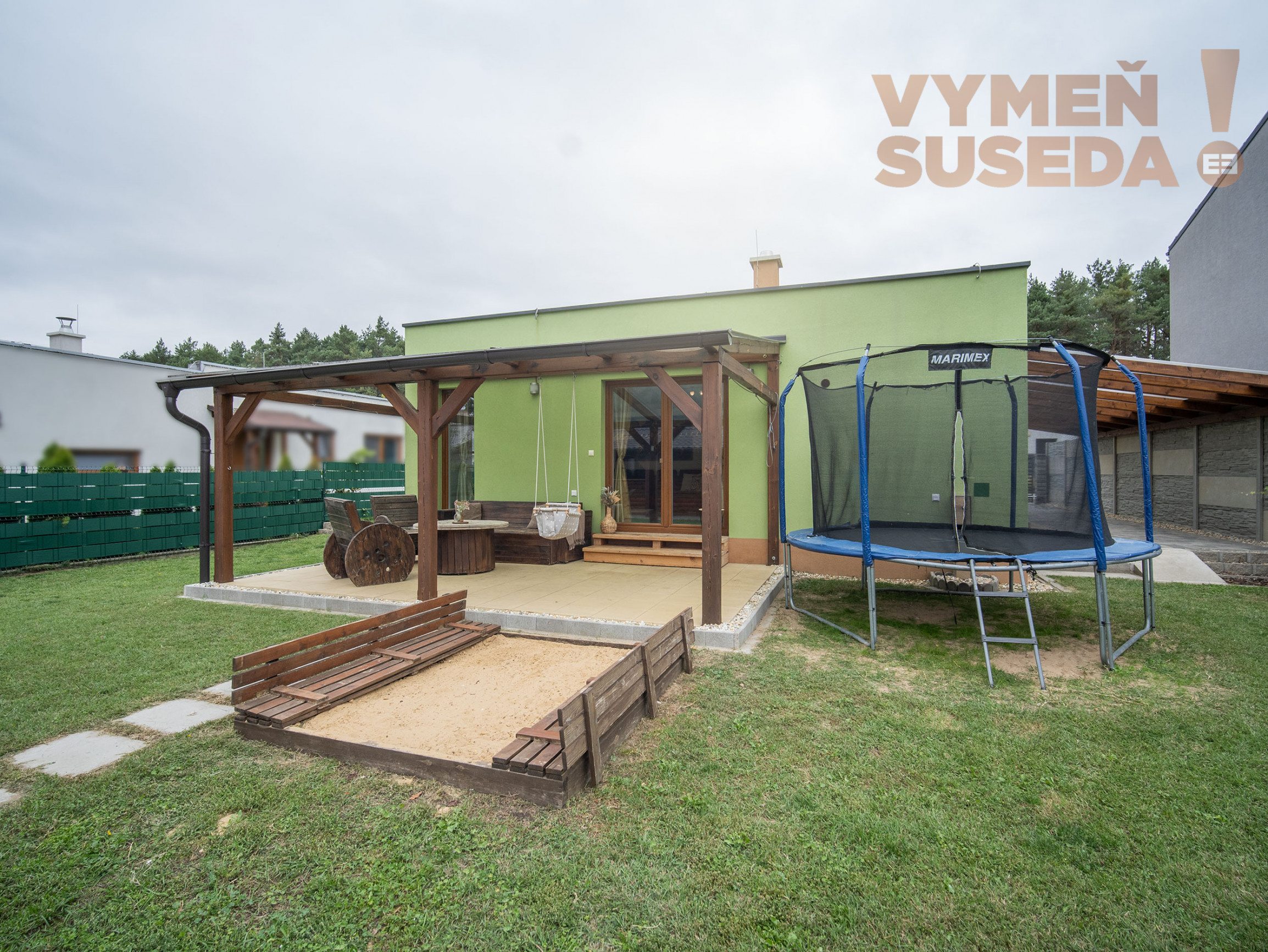 K pohodliu prispieva krytá terasa s výhľadom do záhrady. Pozemok je plný zelene, nechýba ani vinič s trativodom, ktorý slúži ako závlaha. Veľký záhradný domček poslúži ako sklad či dielňa, disponuje vlastným kúrením, elektrickými zásuvkami aj osvetlením. Rodiny s deťmi ocenia pieskovisko a hojdačky pri dome. Parkovanie je vyriešené až pre štyri autá – dve miesta sa nachádzajú pod prístreškom, ďalšie dve pred domom. Komfort dopĺňa automatická brána na diaľkové ovládanie.