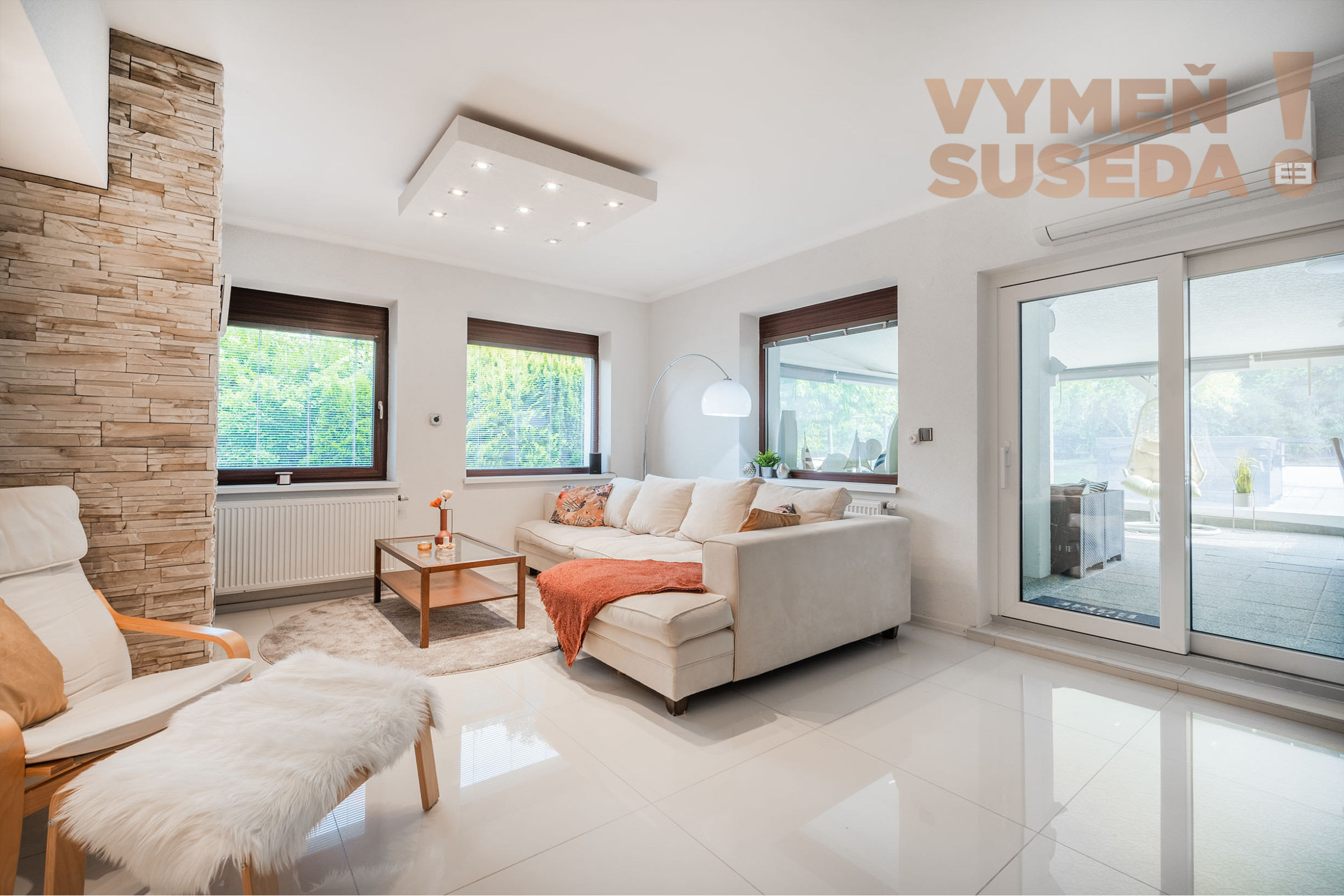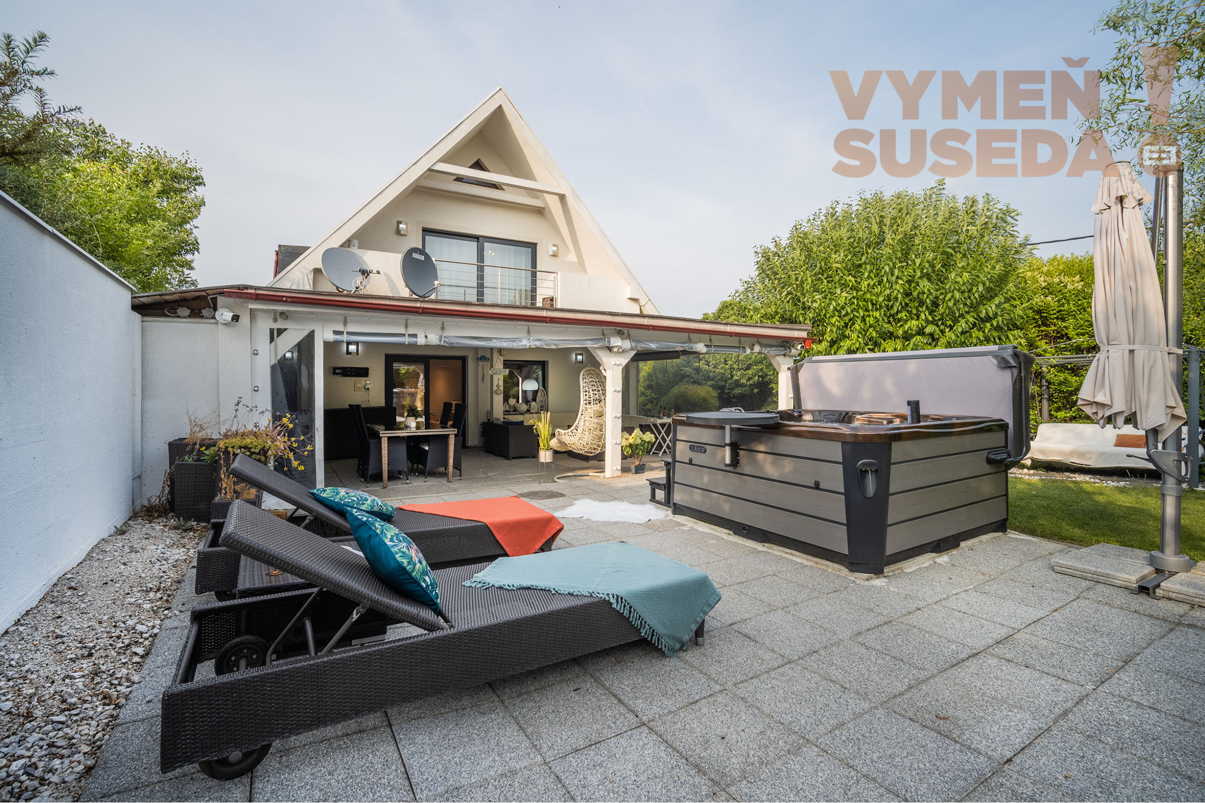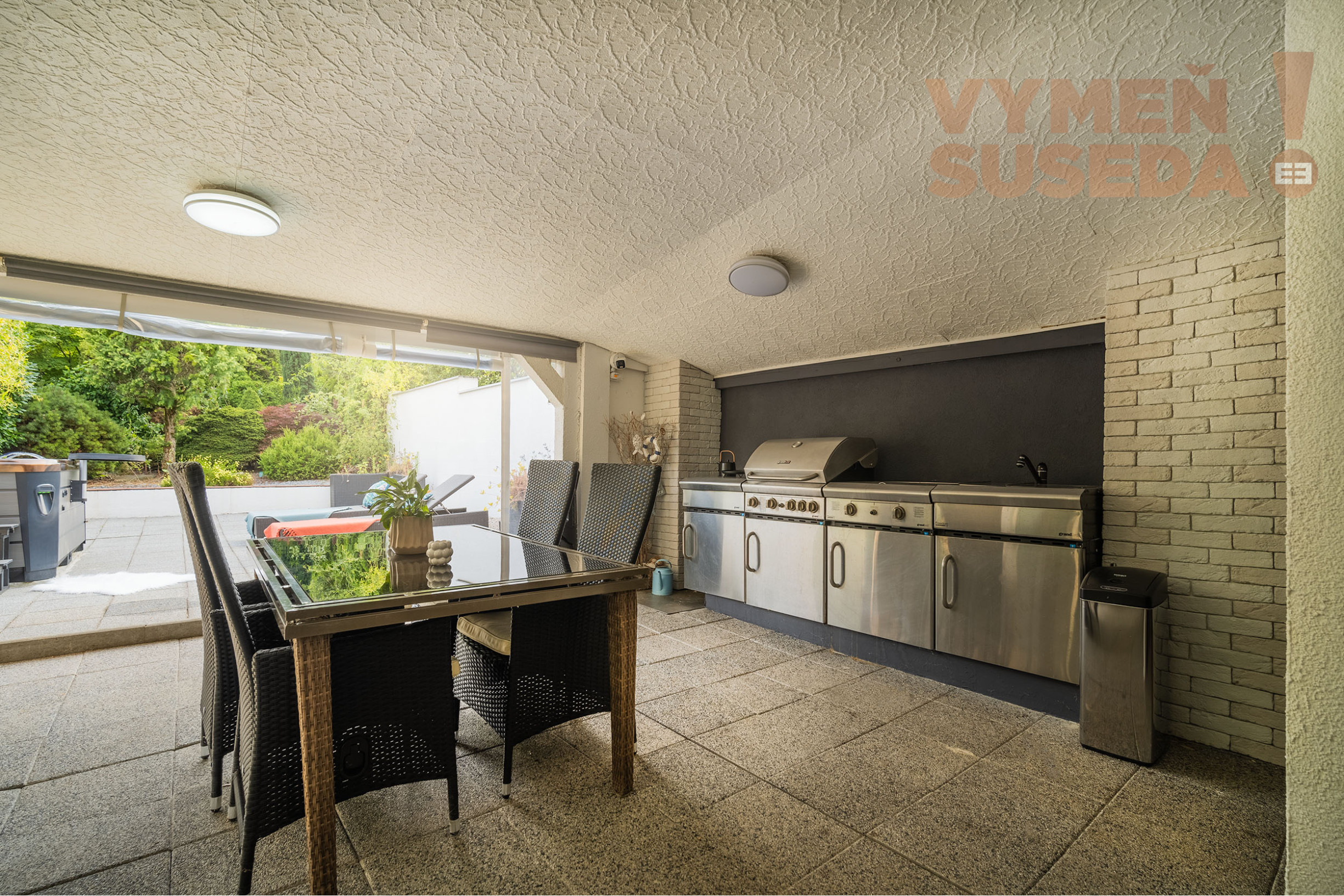 Priestranná obývacia izba s krbom s východom na zastrešenú celoročne využiteľnú terasu s posedením, jedálenskou časťou a profesionálnym grilom so záhradnou kuchyňou s východom na exteriérovú terasu na ktorej sa nachádza relaxačná zóna s lehátkami a vírivka