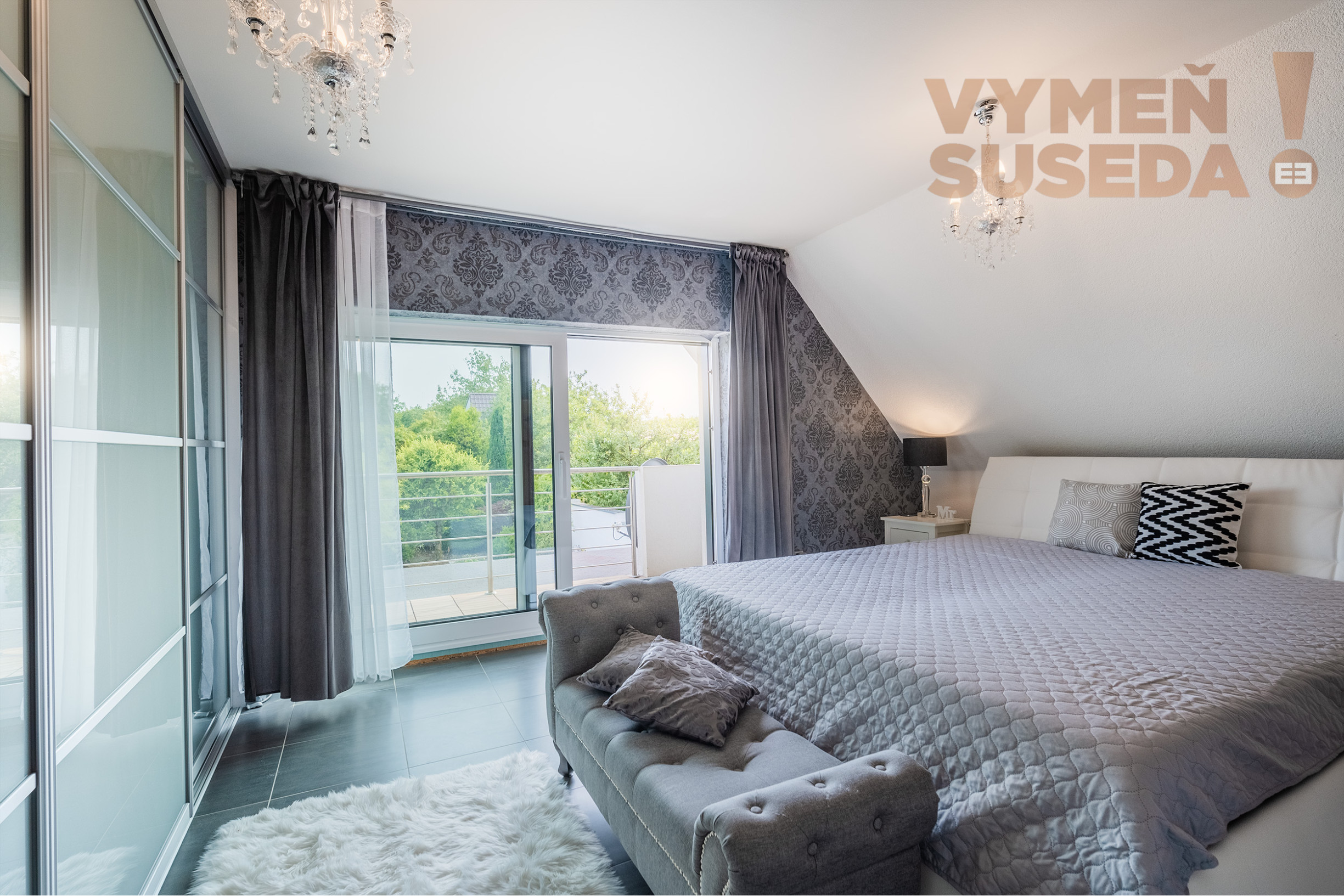 Priestranná hlavná spálňa s terasou s výhľadom do záhrady plnej zelene a okolité vinohrady a lúky, s vlastným ,,WALK IN“ šatníkom