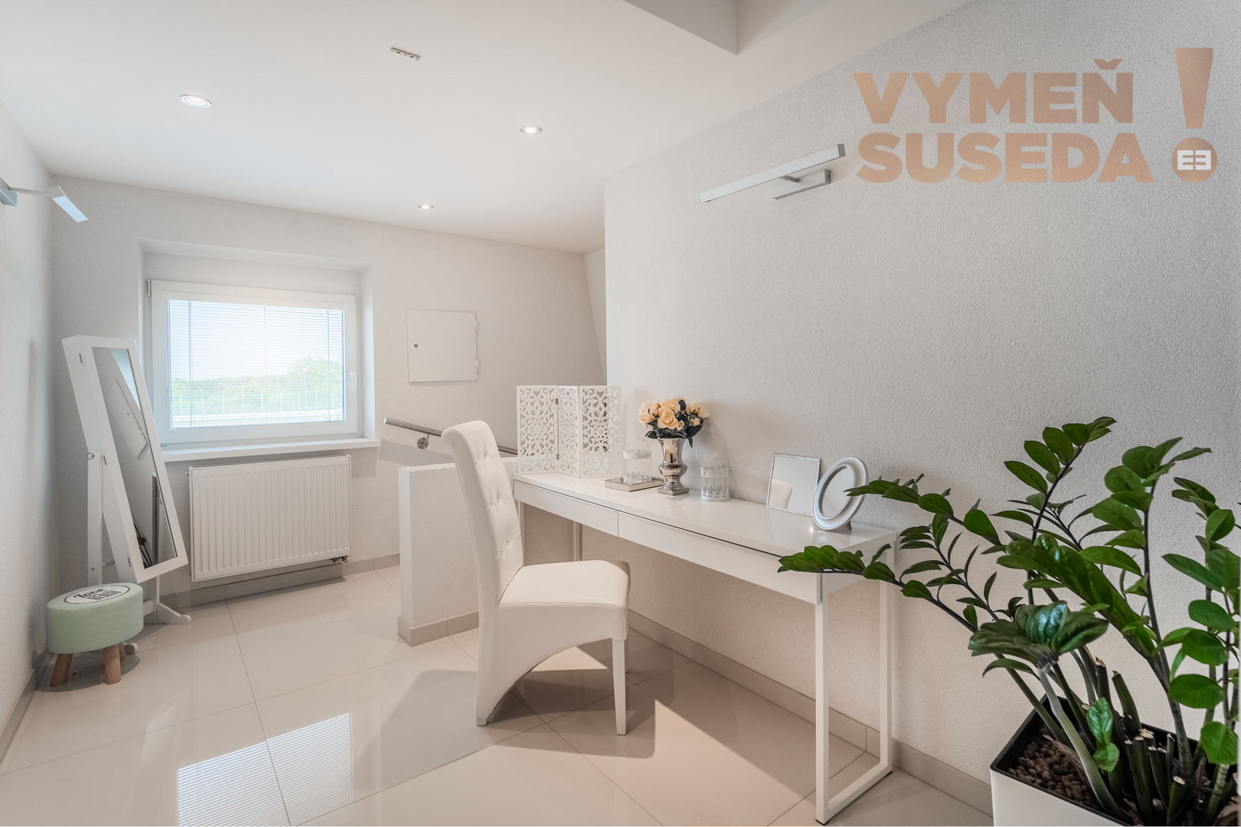 Otvorená chodba s kozmetickým kútikom s oknom a východom na povalu ktorá poskytuje ďalší úložný priestor.