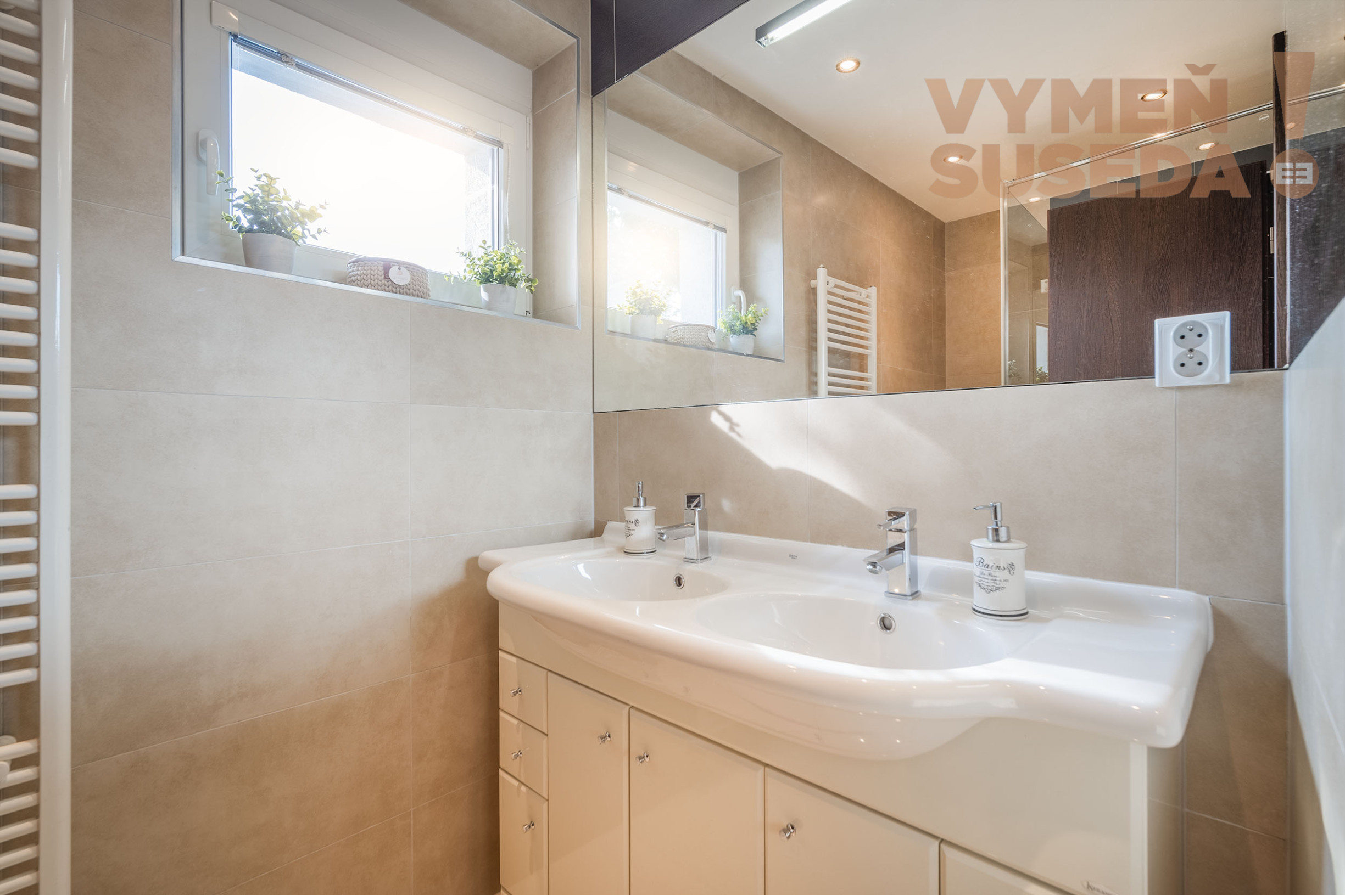 Veľká kúpeľňa s oknom, rohovou vaňou s dvomi umývadlami toaletou a bidetom