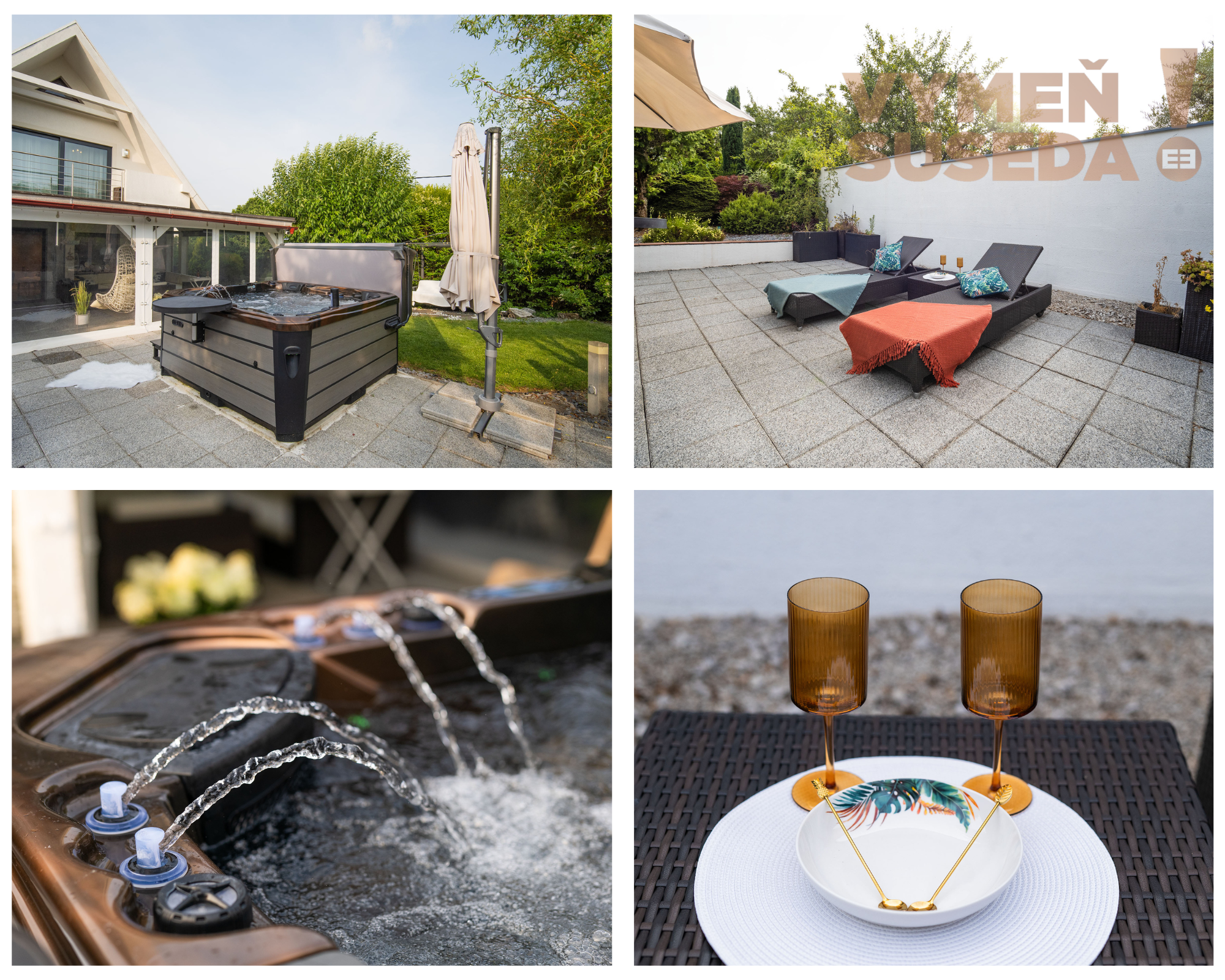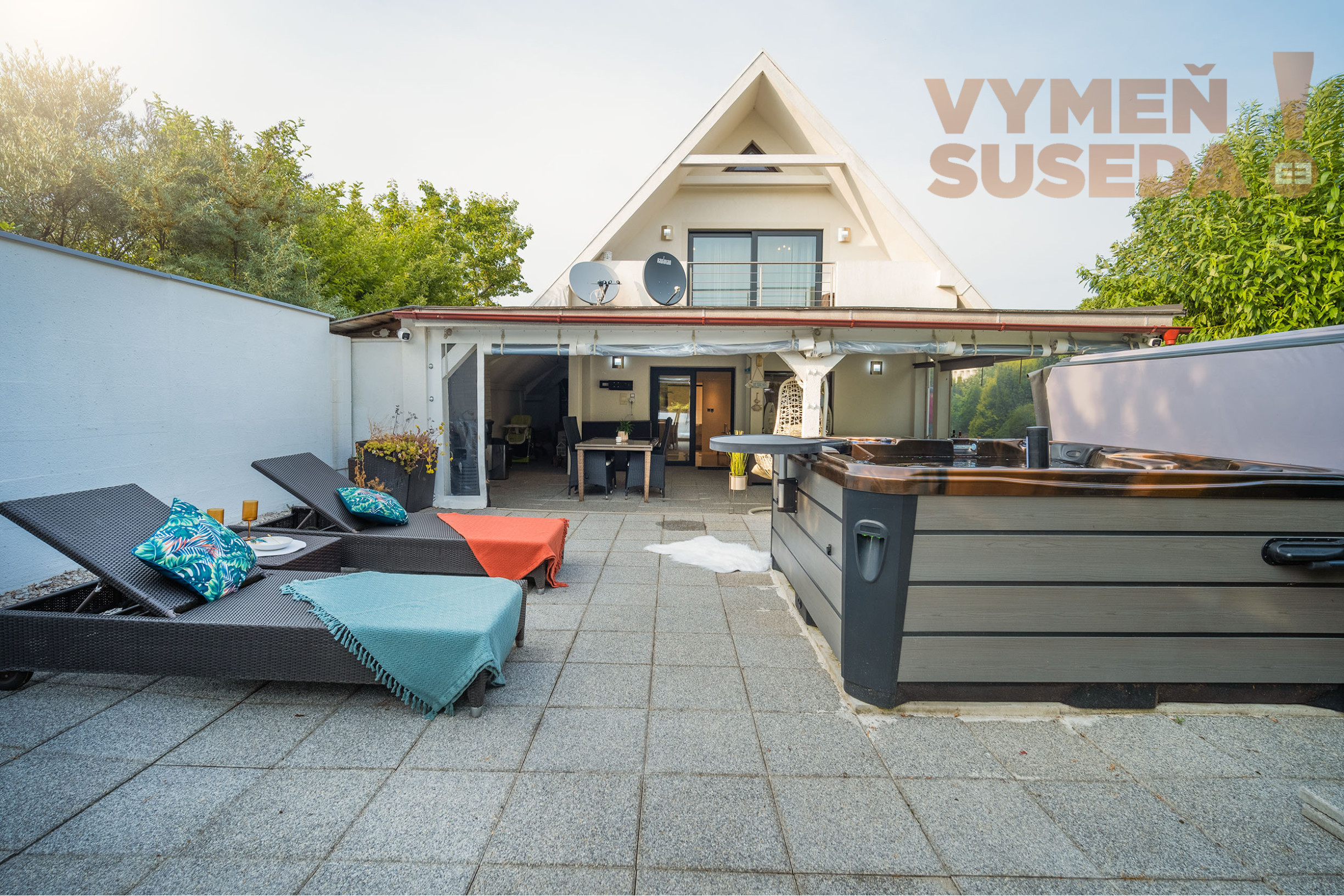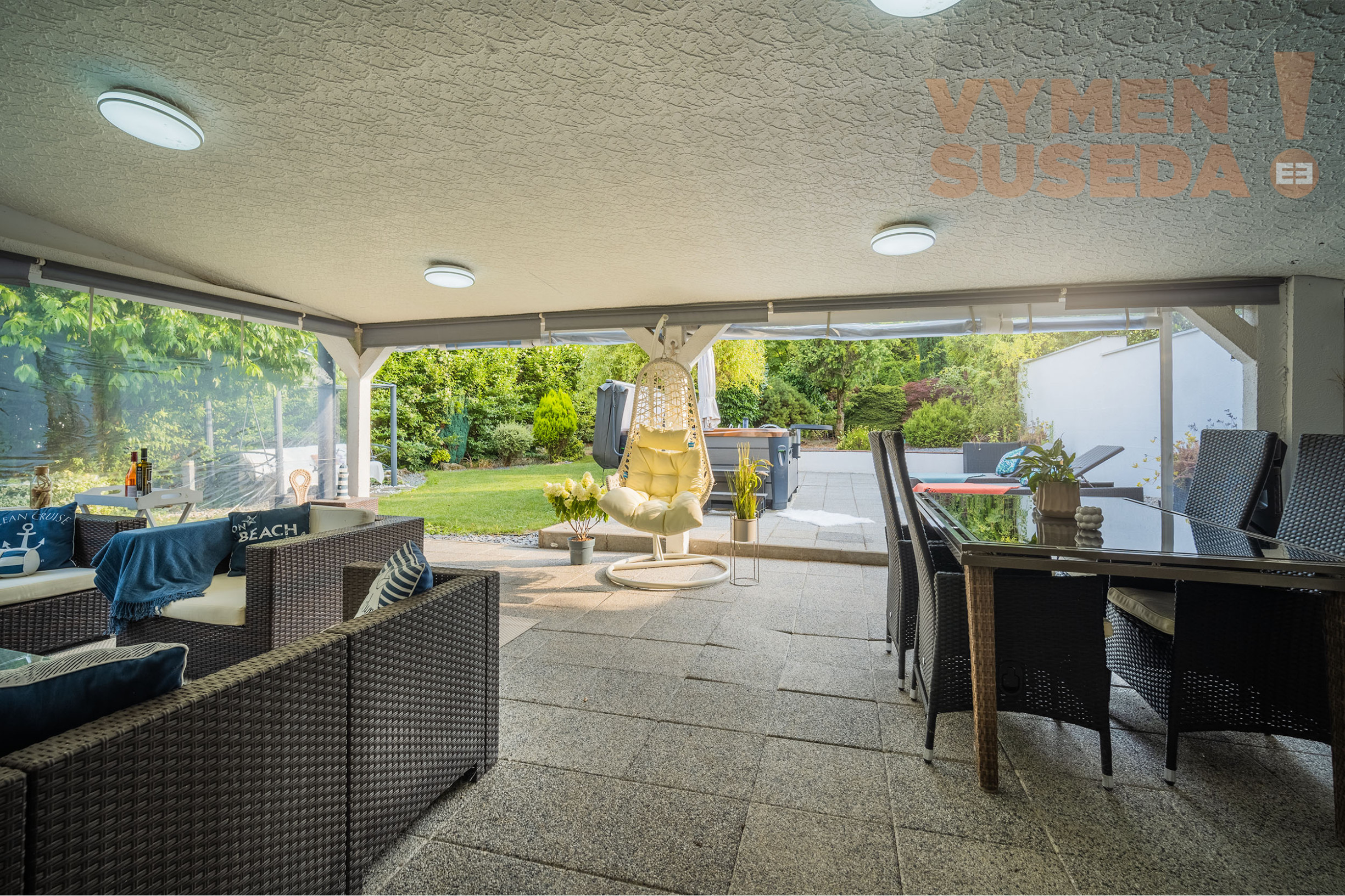 Priestranná obývacia izba s krbom s východom na zastrešenú celoročne využiteľnú terasu s posedením, jedálenskou časťou a profesionálnym grilom so záhradnou kuchyňou s východom na exteriérovú terasu na ktorej sa nachádza relaxačná zóna s lehátkami a vírivka