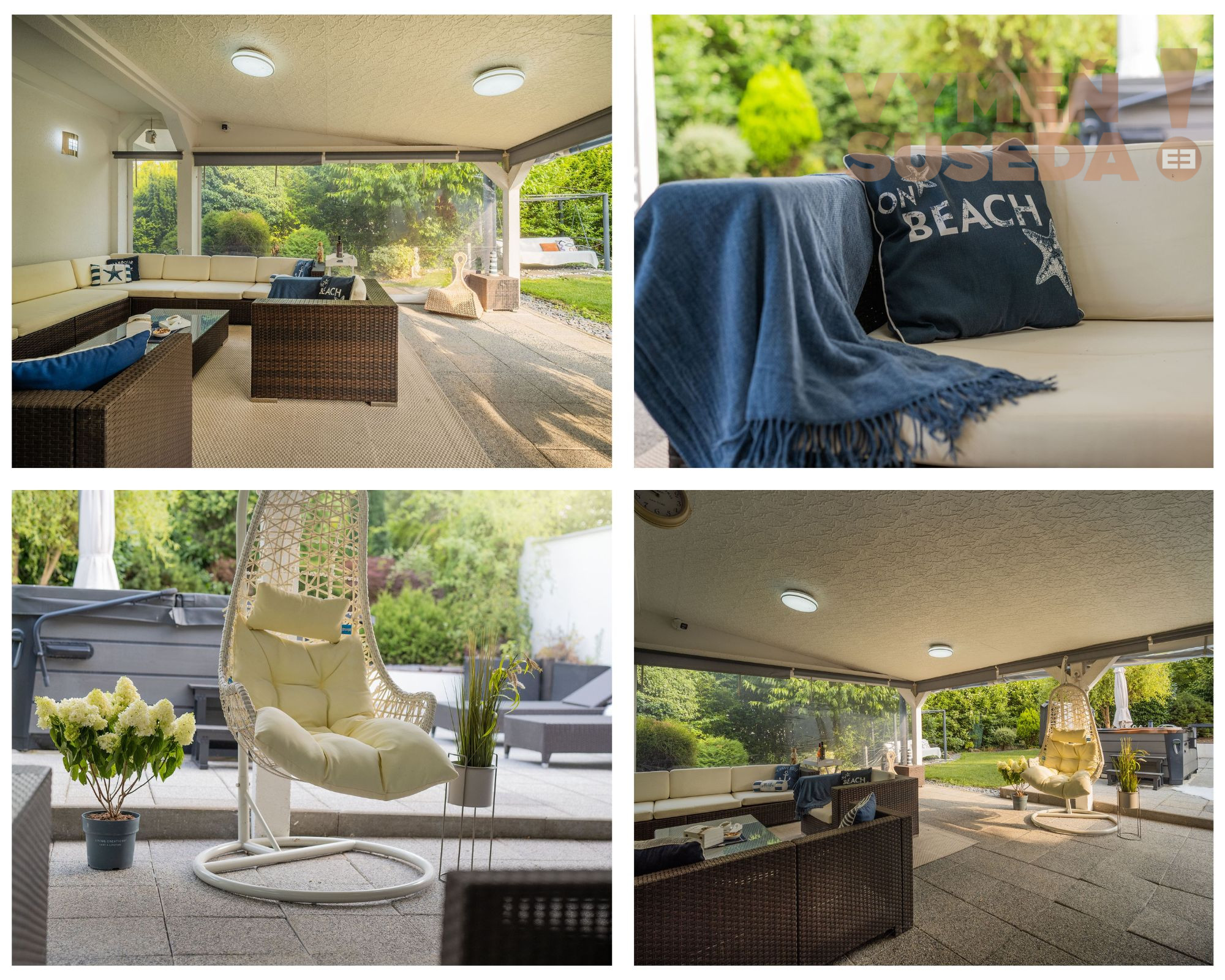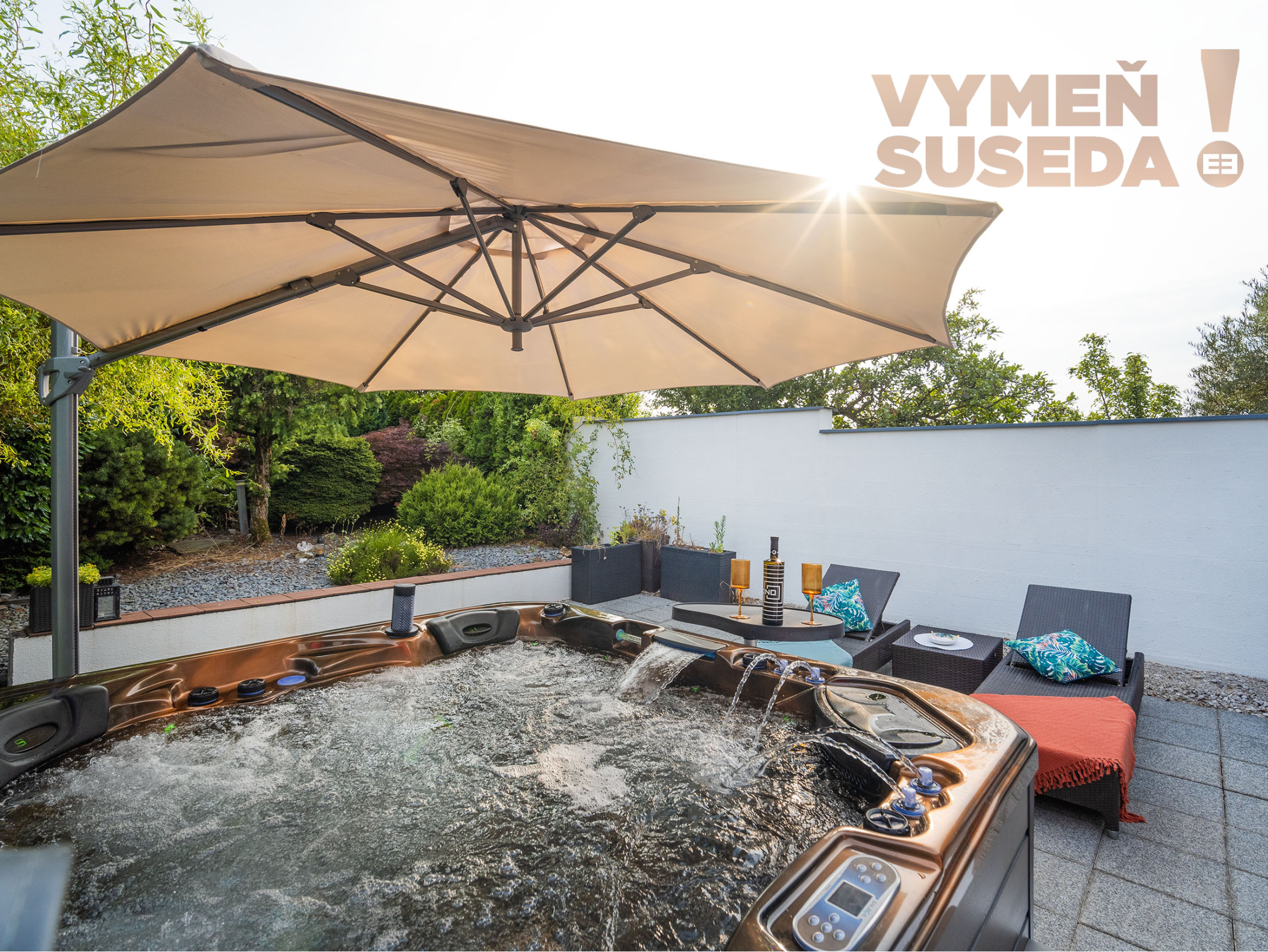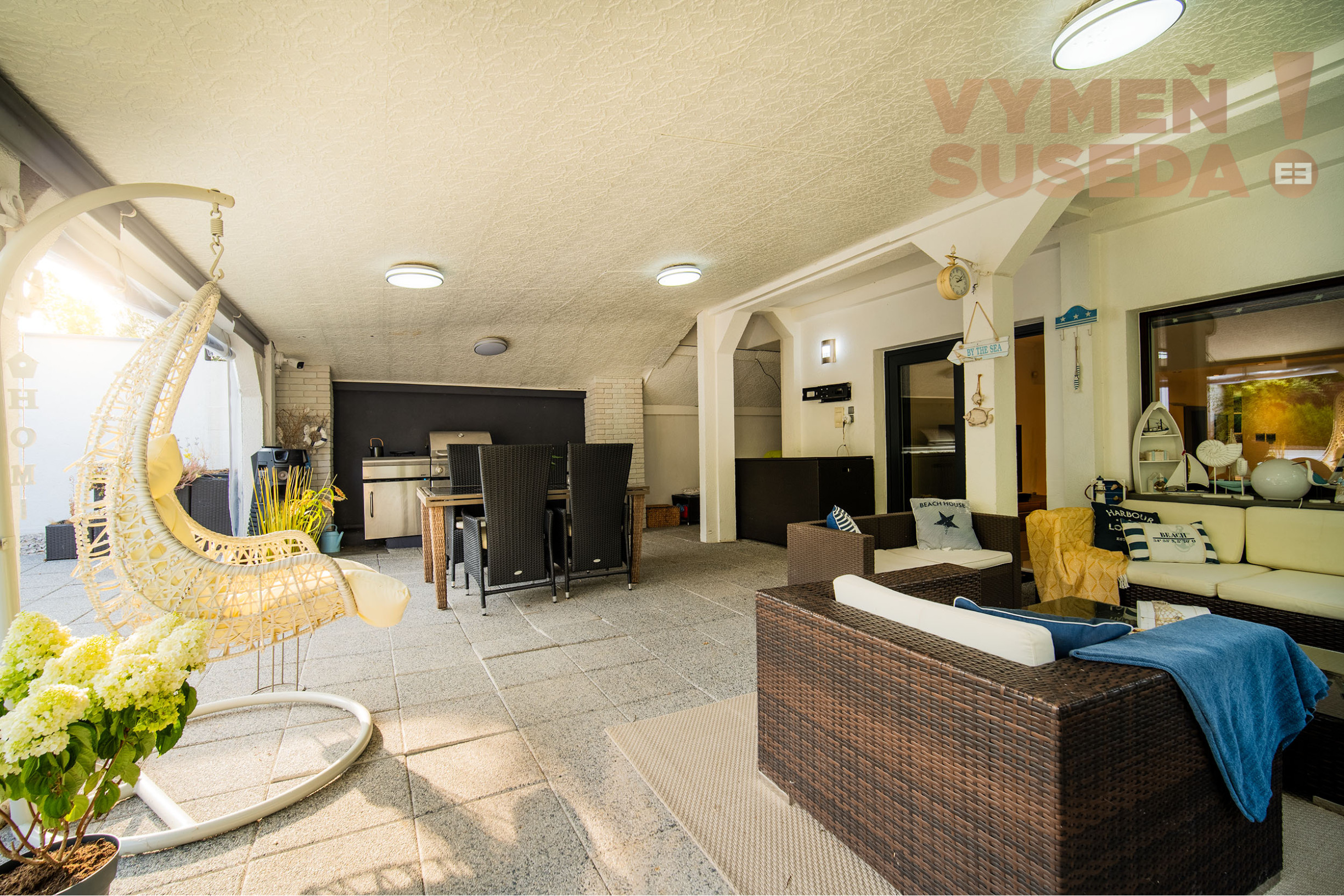 Priestranná obývacia izba s krbom s východom na zastrešenú celoročne využiteľnú terasu s posedením, jedálenskou časťou a profesionálnym grilom so záhradnou kuchyňou s východom na exteriérovú terasu na ktorej sa nachádza relaxačná zóna s lehátkami a vírivka