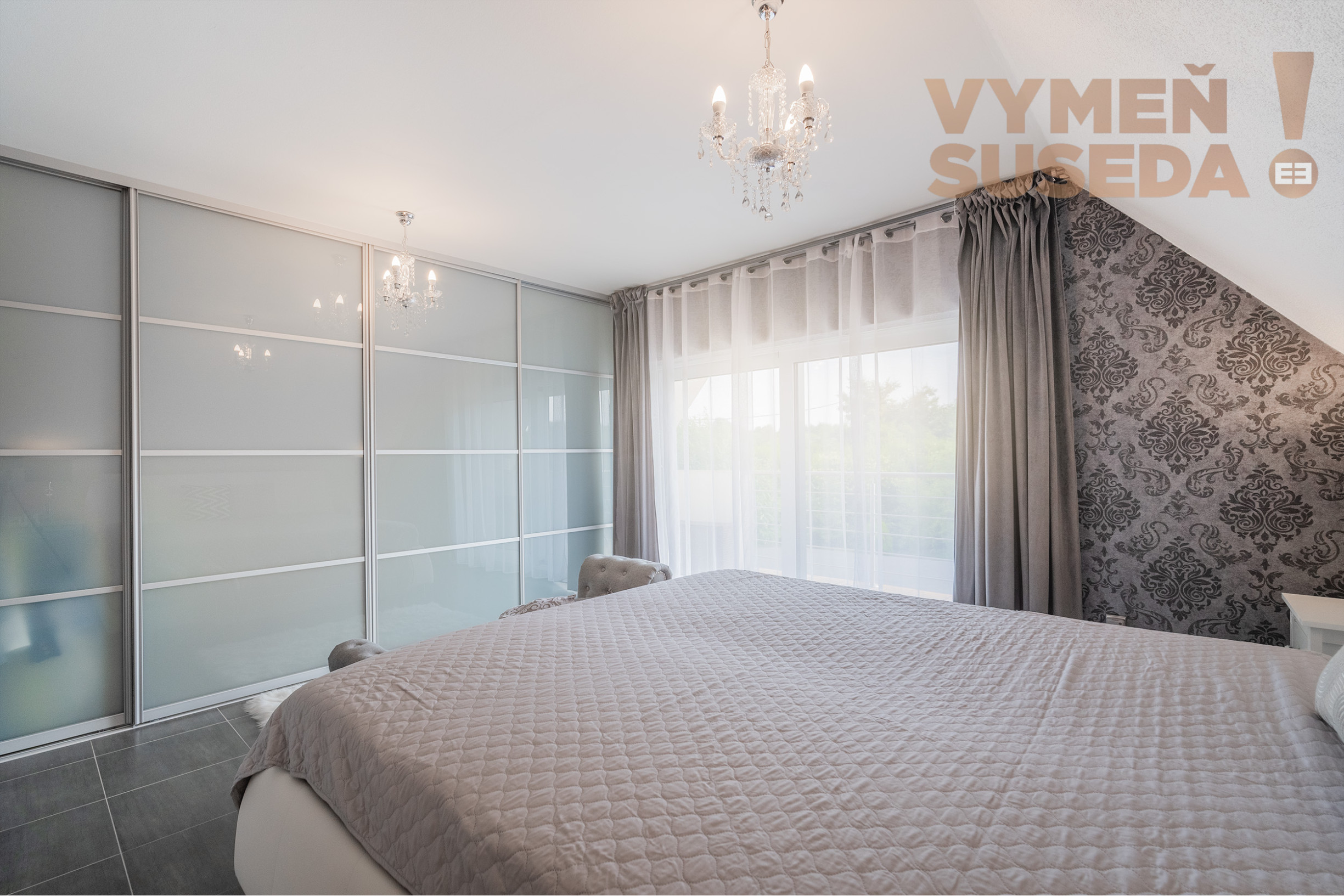Priestranná hlavná spálňa s terasou s výhľadom do záhrady plnej zelene a okolité vinohrady a lúky, s vlastným ,,WALK IN“ šatníkom