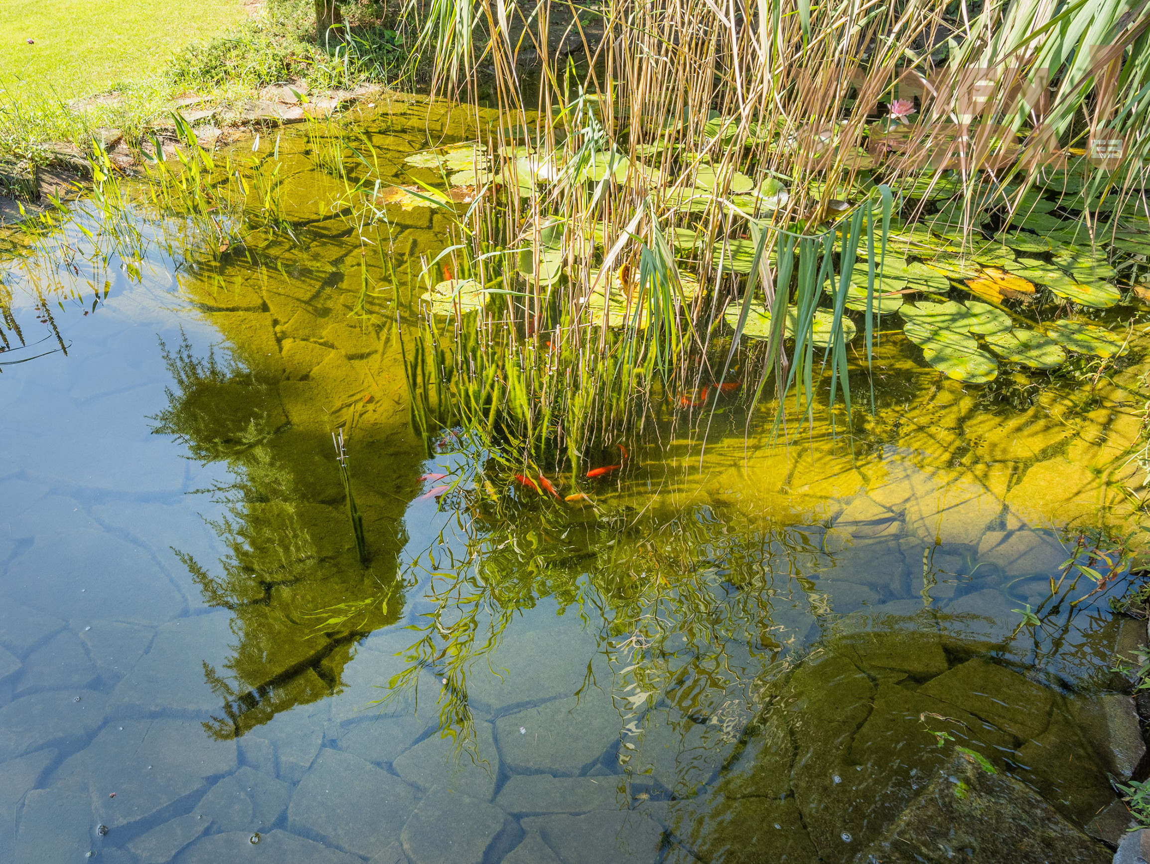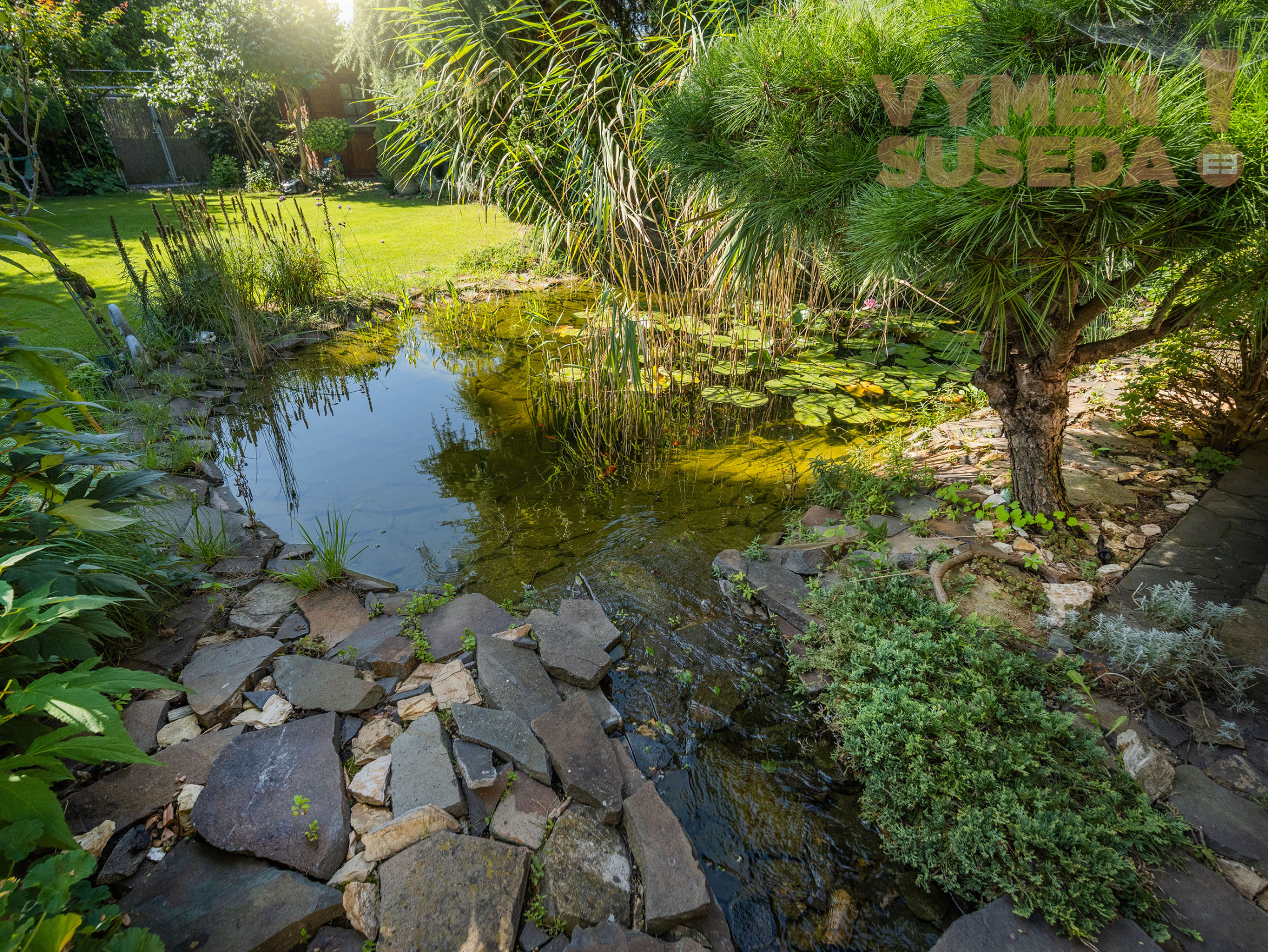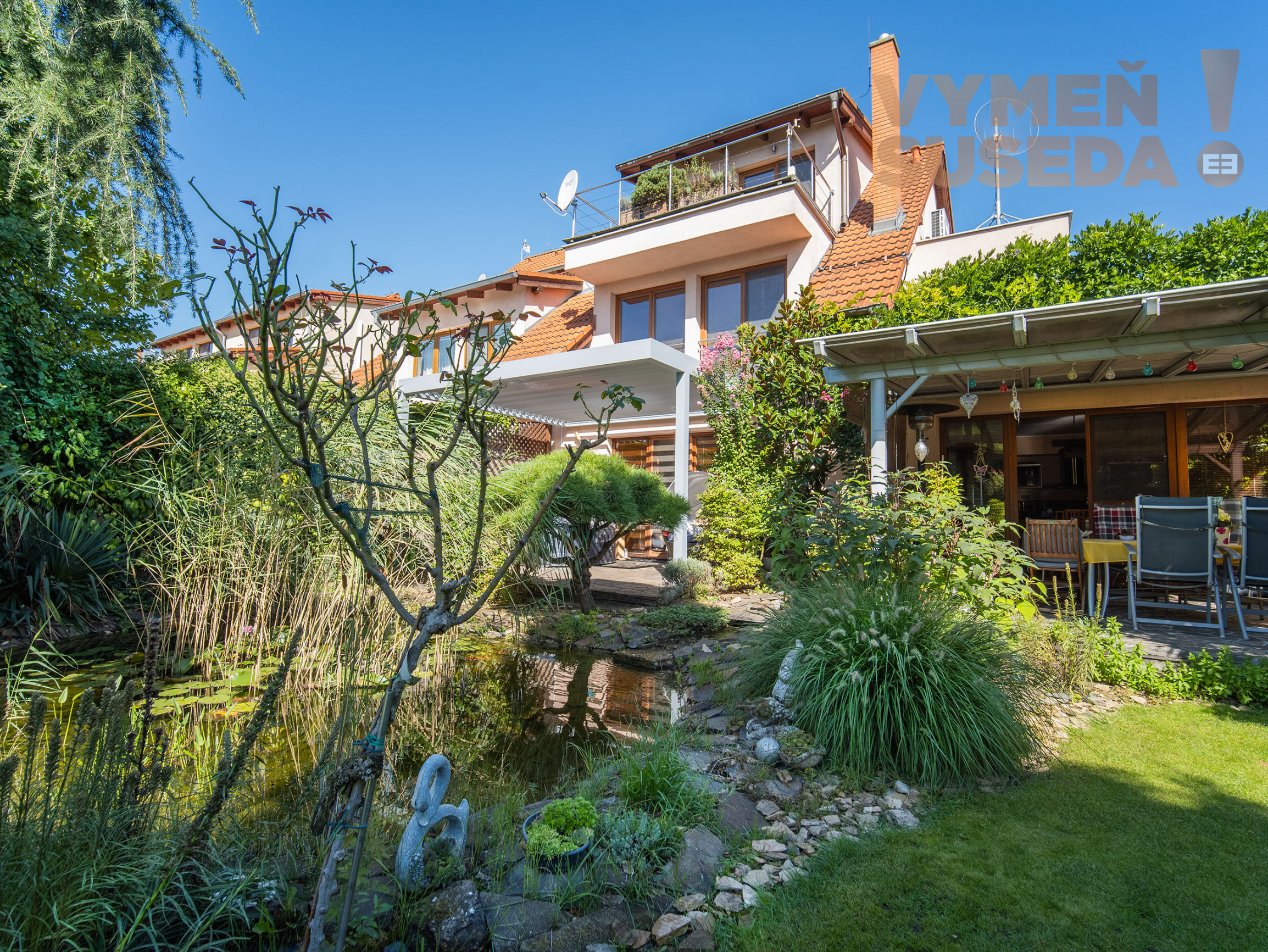 Pozemok o celkovej výmere 536,00 m2 s jazierkom a tečúcim potokom, s dvomi zastrešenými terasami s vírivkou je parkovo upravený, plný zelene.