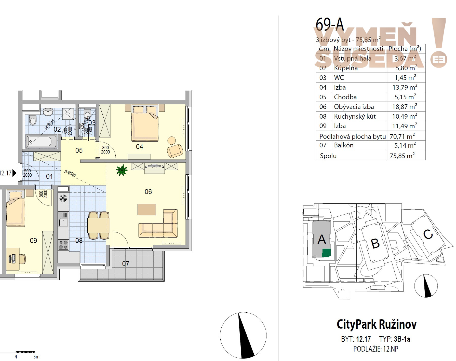 Ponúkame na prenájom výnimočný 3 izbový byt s balkónom v novostavbe s celkovou výmerou 75,85 m2 vrátane balkóna o výmere 5,14 m2 s príjemnou atmosférou a množstvom úložného priestoru.